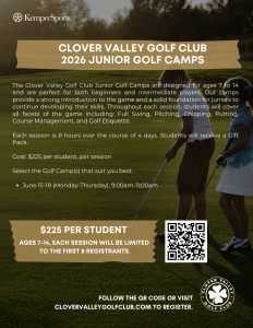 Junior Golf Camps Junior Golf Camp Is Back This Summer at Clover Valley Golf Club! ] Golfers must bring their own clubs. 🔗 Sign up today: CLICK HERE 🔗 Camper Form: CLICK HERE Questions? Contact Scott Thielsen at sthielsen@kempersports.com Let’s tee up a great summer for your junior golfer!